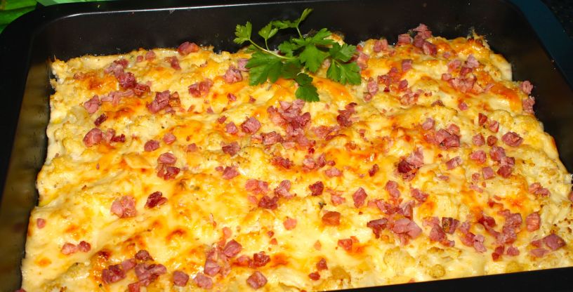 Escurrimos nuestra coliflor y ponemos en una bandeja de forma que no quede muy alta, si es necesario, romperla un poco para que no quede coliflor fuera de la bechamel.