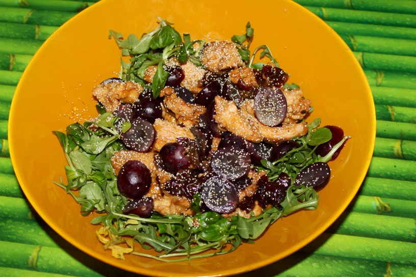 Ponemos en una ensaladera los canónigos ( puedes poner las hierbas o lechugas que prefieras: rúcula, col lombarda muy finita, brotes, etc) y ya solo queda añadir nuestra guarnición templada, unas uvas negras partidas por la mitad y sin huesos y unas semillas de amapola.