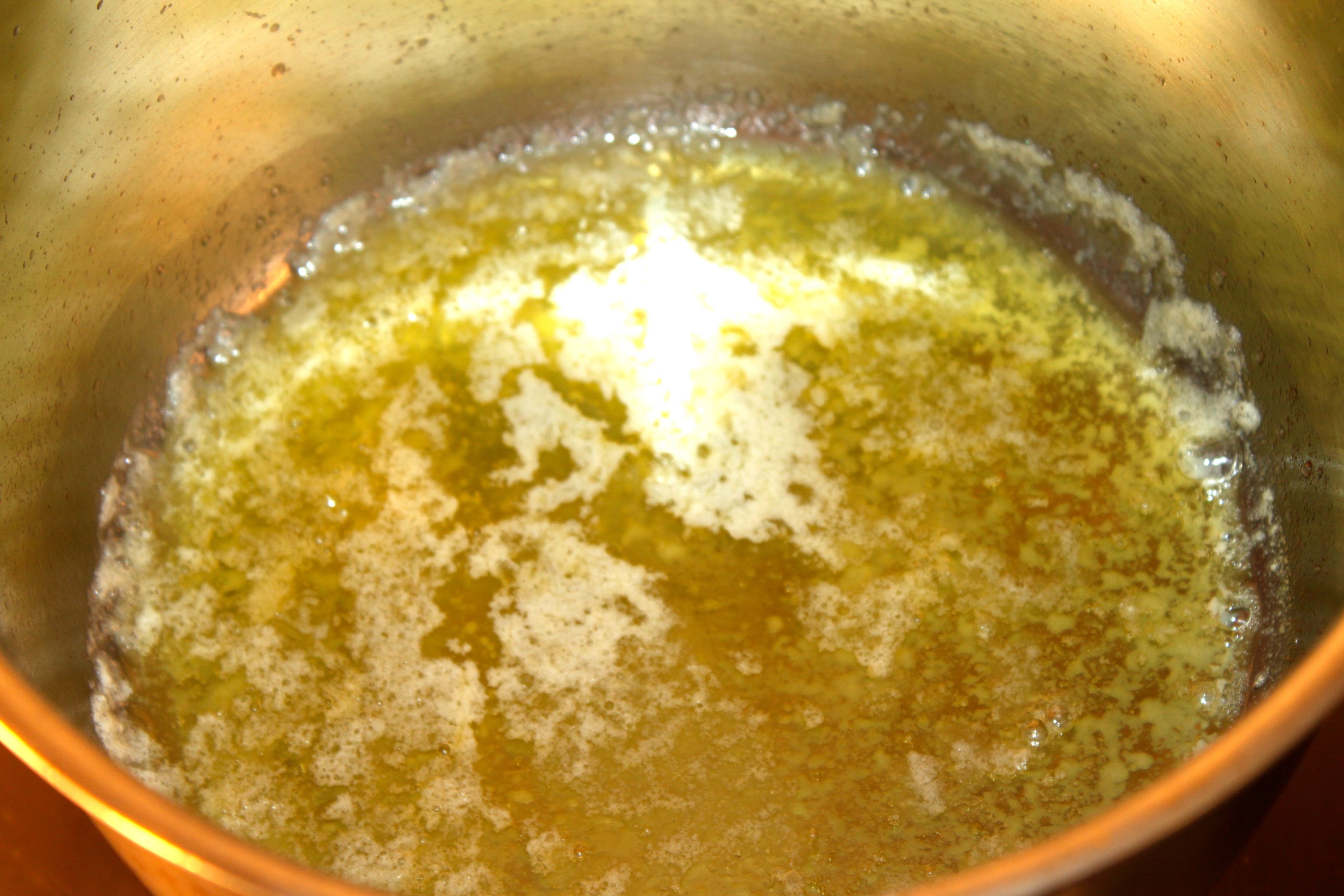6. Bechamel: Para la bechamel pondremos la mantequilla en un cazo a fuego medio, cuando haya derretido, añadimos las dos cucharadas de harina y removemos hasta que quede un color marrón claro (si se pone muy oscuro es que la harina está quemada, así que sería mejor empezar de nuevo a seguir adelante)