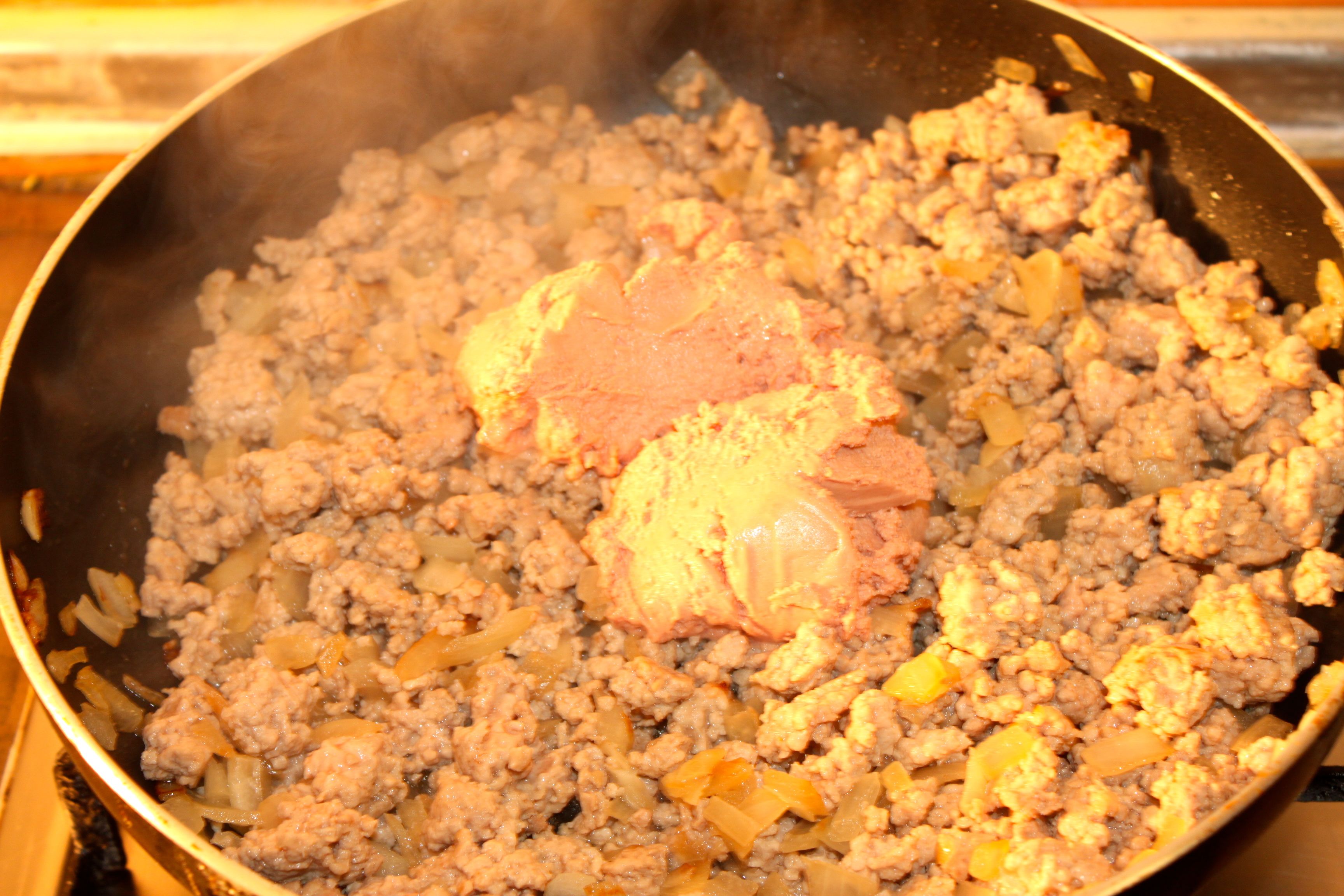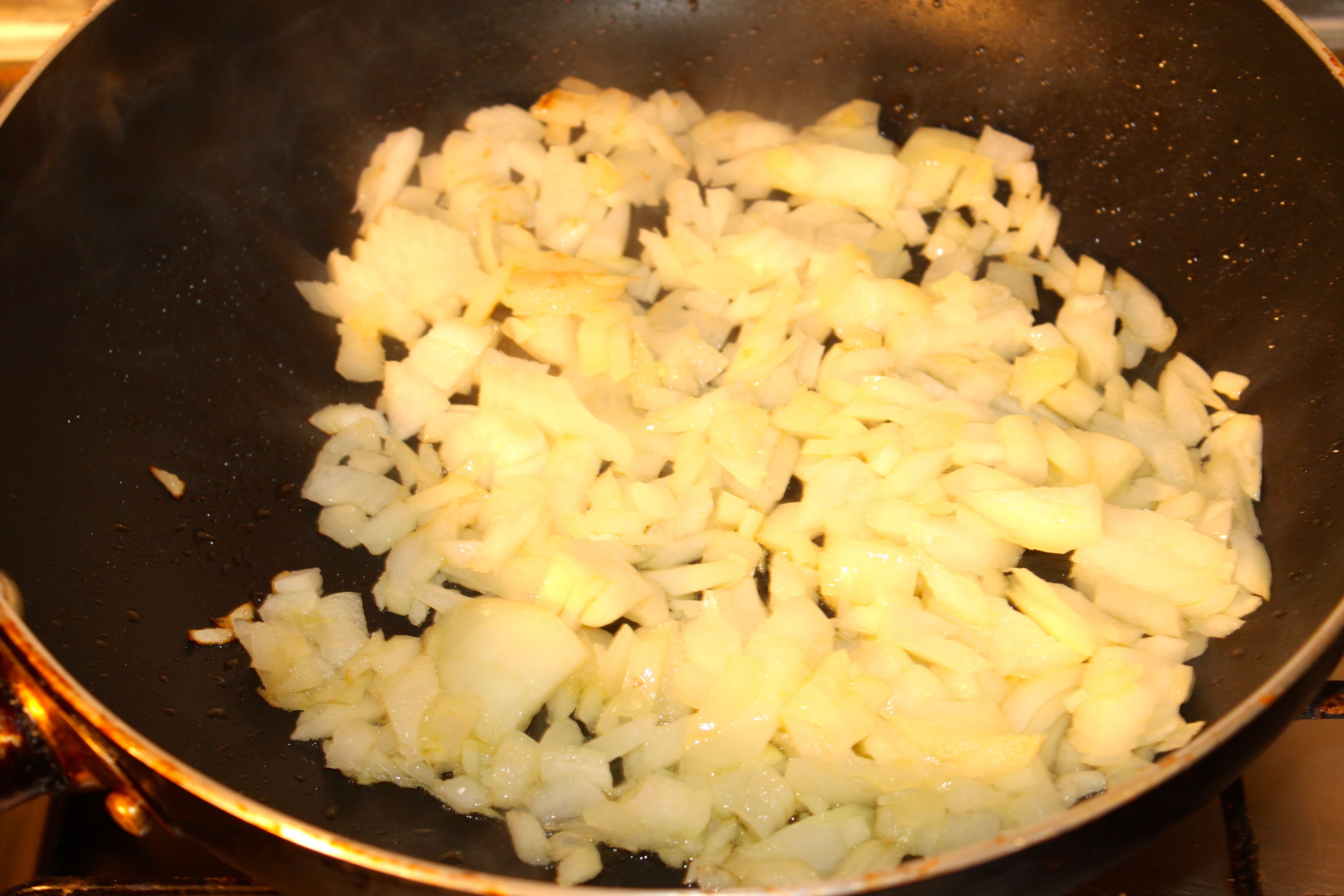 1. Ponemos la cebolla cortada a pochar con el aceite de oliva. Cuando esté dorada añadimos la carne. Podemos añadir un poco de vino blanco o cerveza si nos apetece.
