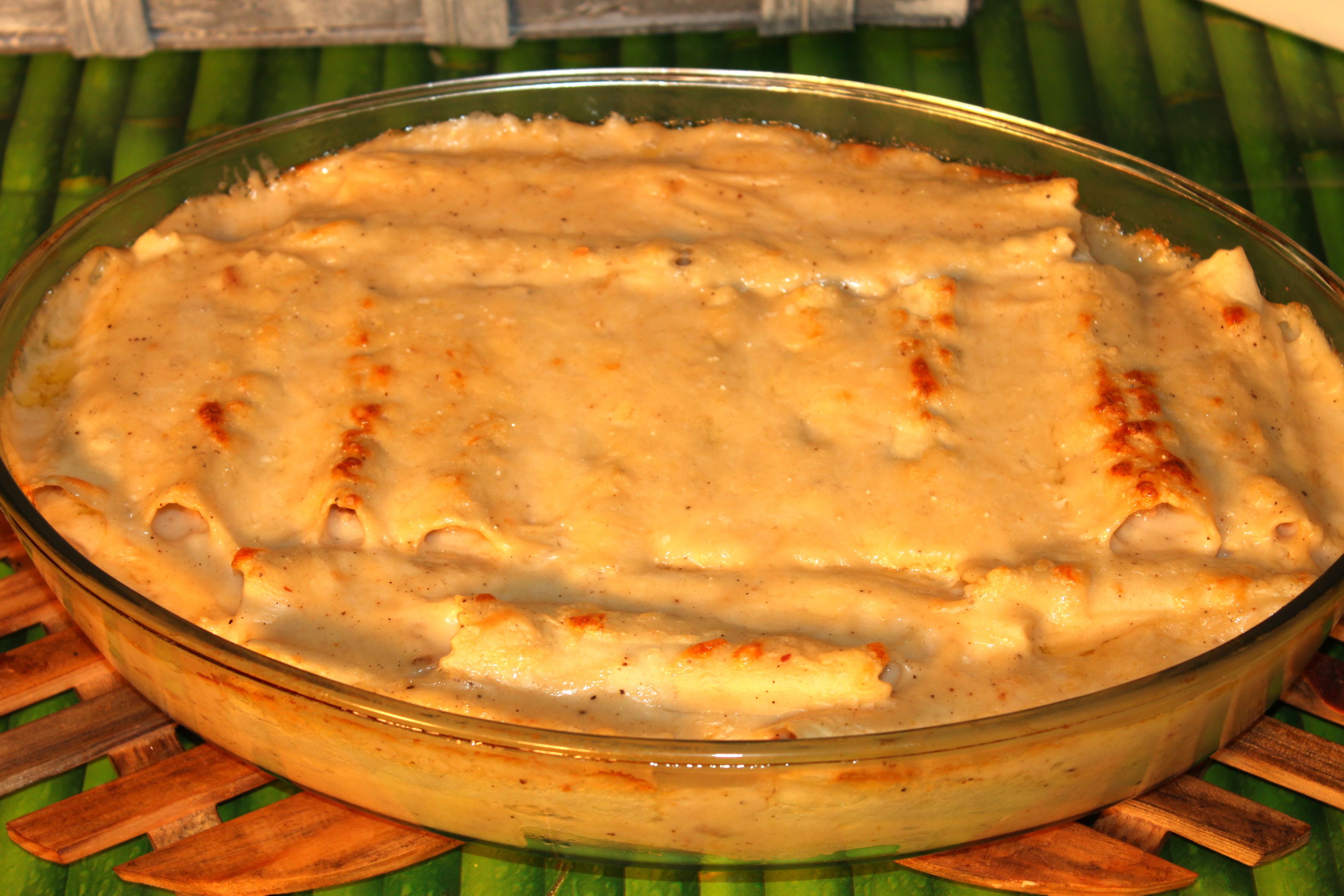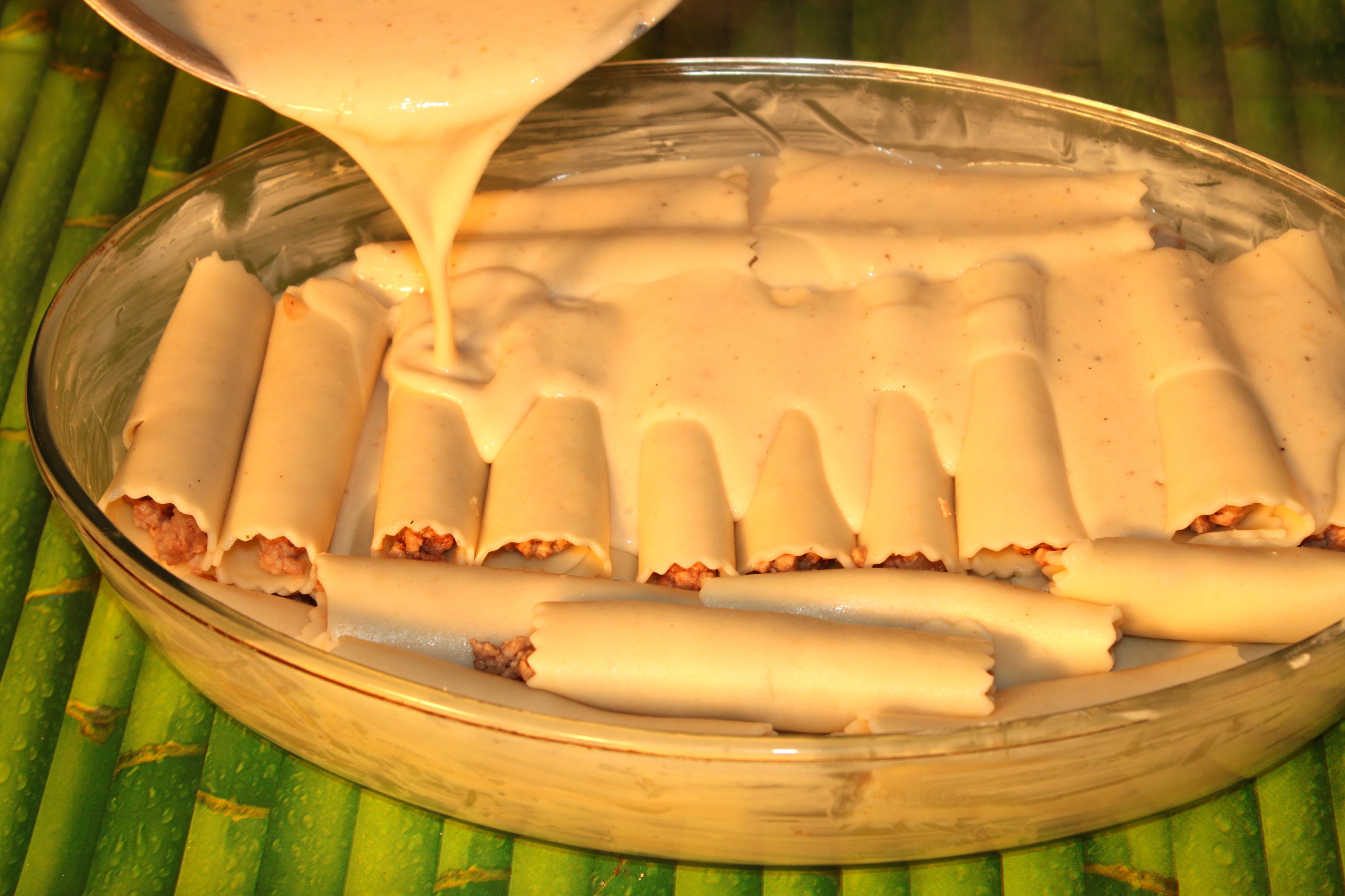 7. Ya estamos listos para bañar nuestros canelones. Si nos hemos quedado cortos siempre es preferible hacer un poco más de bechamel y añadirla, que queden cubiertos. Luego, en el horno, la bechamel se espesará más aún.