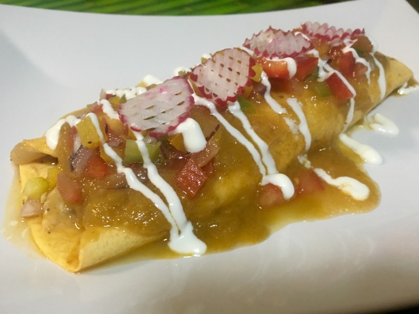 - Para terminar, tomamos las tortillas de maíz y tomate y metemos el relleno de pollo con verduras, las cerramos pero sin apretar, que queden anchas. Vertemos la salsa verde por encima, un poco de pico de gallo, la crema agria y decoramos con unos rabanitos, zanahorias o cualquier otra cosa que nos apetezca que pueda quedar bonita como unos aros de cebolla morada o perejíl o cilantro finamente picado.