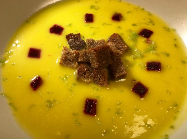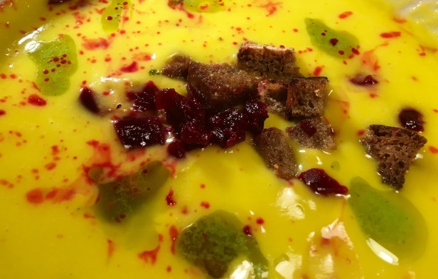 También si preferimos ser más sobrios en el emplatado podemos añadir el clásico chorrito de AOVE y nada más. El color verdoso del aceite hará un contraste estupéndo con la crema amarilla.