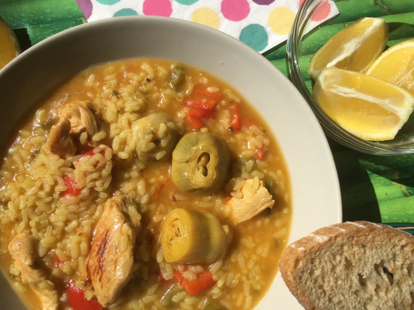 Receta de arroz caldoso con pollo y alcachofas, arroz típico de los Montes de Málaga. Sencillo, rápido y sano, tan sólo lleva unos cuantos ingredientes pero el sabor es de otro mundo: pimientos, ajos, perejil…