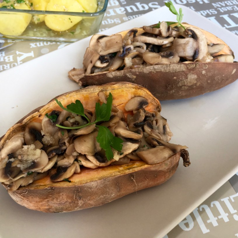Viendo recetas por ahí vi que lo hacían al horno con una raja en medio y luego lo llenaban con pistos, mezclas de verduras, sofritos, etc. Y se me ocurrió rellenarlo de un rico revuelto de champiñón, calabacín y cebolla pochada con aceite de coco.