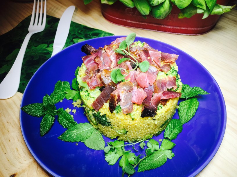 Os traigo un delicioso plato a base de quinoa frita aromatizada con cúrcuma y acompañada de brócoli y mojama de atún.