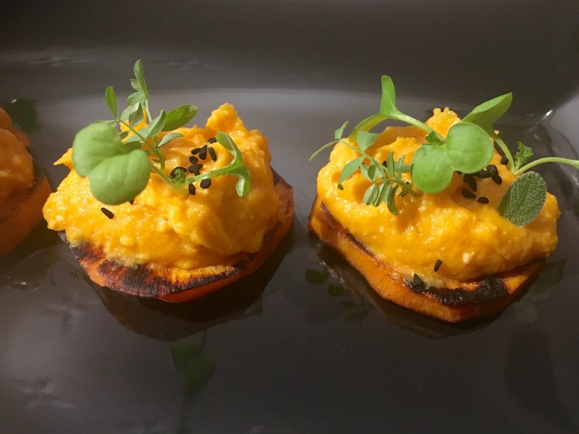 - Cortamos y pelamos los boniatos crudos en rodajas y los hacemos a la plancha con un chorrito de AOVE a fuego medio, hasta que cojan color. Ponemos en un plato y añadimos el humus de boniato y piñones. Decoramos con sésamo negro y/o brotes y si queremos un toque de pimentón de la vera y/o AOVE y sal maldon.