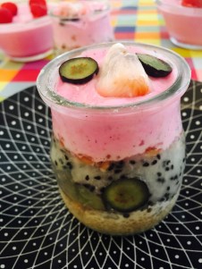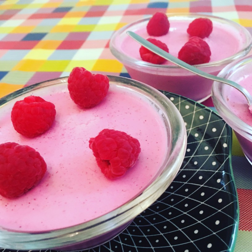 - Dejamos reposar unos minutos y ponemos en recipientes al gusto. Tendremos que dejar enfriar por completo al menos una noche o unas 12 horas. Luego decoramos al gusto, yo puse frambuesas por encima y sirope de ágave para los más dulceros.
