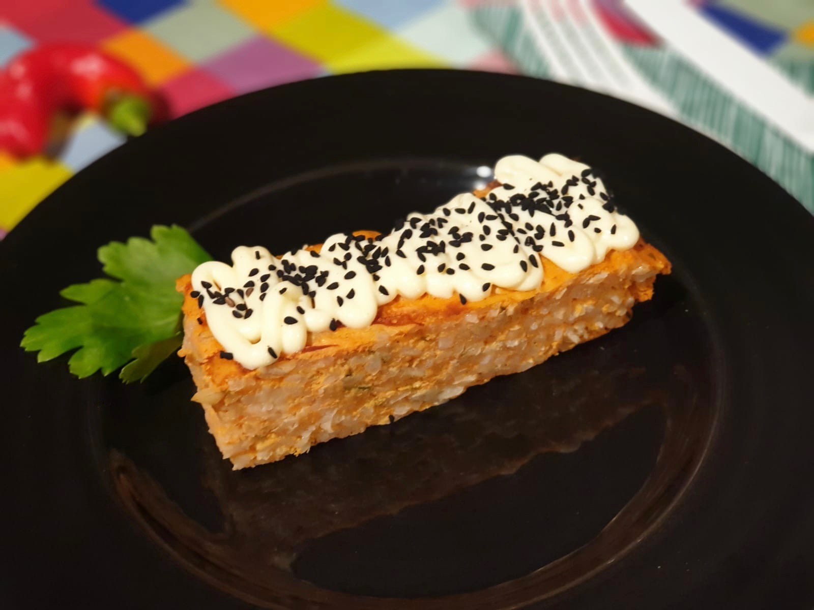 - Batimos los pimientos con la cebolla y añadimos en un bol grande los huevos, el arroz y el resto de ingredientes. Colocamos en una bandeja no muy grande, para que nuestro pastel tenga cierta altura, un papel de horno y vertemos nuestra mezcla. Podemos poner otro papel por encima para que no se tueste demasiado la parte de arriba. Horneamos a 180ºC unos 20 minutos o hasta que no esté blando.