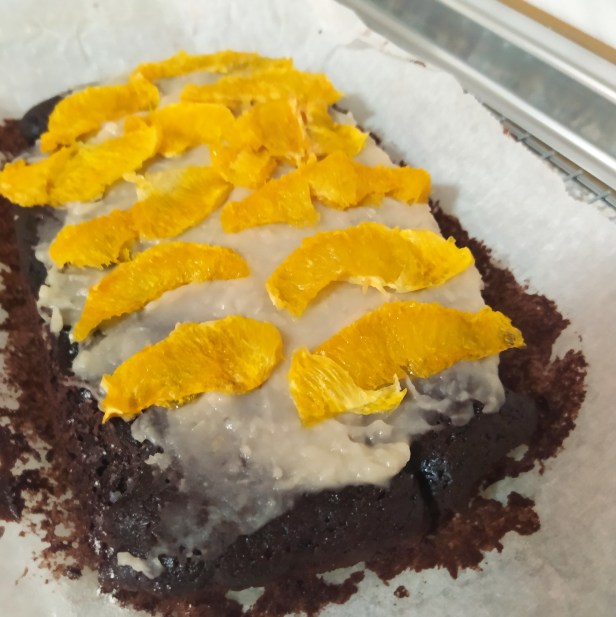 Para decorar napar con la crema de alubias y también he usado unas naranjas desecadas que había desecado por no tirarlas en una máquina deshidratadora que tengo. Se puede decorar con fruta escarchada, ralladura de chocolate blanco, arándanos desecados cortados a cuchillo o chips de chocolate…